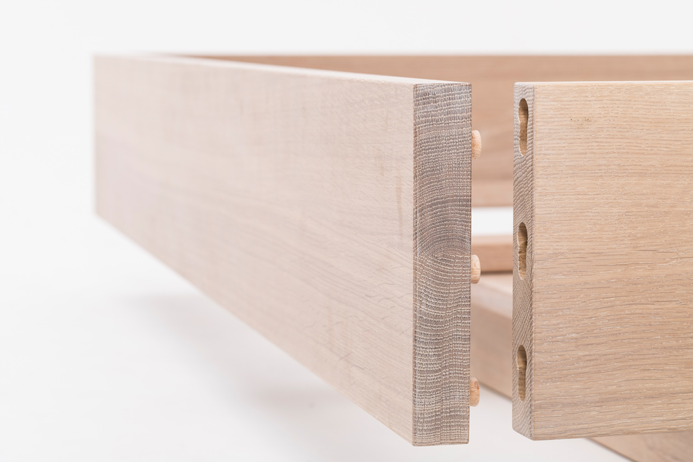Spannkeilverbindungen werden bereits seit Jahrhunderten im Möbelbau verwendet. Diese adaptierte Holzverbindung besteht aus einem großen, langen Dübel, der von der Gegenseite mit einem Spannkeil gesichert wird. Sie ist einfach im Zusammenbau und lässt sich auch wieder leicht lösen.